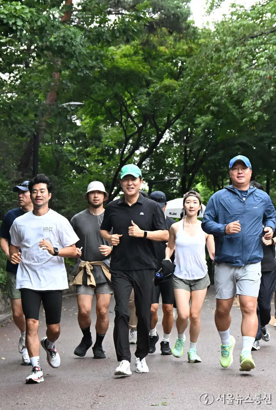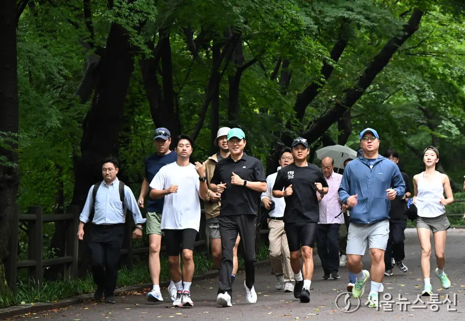 【서울 = 서울뉴스통신】 이민희 기자 = 오세훈 서울시장이 아침현장소통 첫 날인 15일 오전 시민들과 서울 남산 북측순환로를 함께 달리고 있다. 이날 오 시장은 아침현장소통 첫 행보로 시민과 함께 남산 국립극장~중부공원여가센터(중구 예장동) 2km 구간을 달린 뒤 남산을 찾는 러너를 위해 마련된 남산샤워장 시설을 점검했다. (서울시 제공) 2025.07.15. / snakorea.rc@gmail.com
