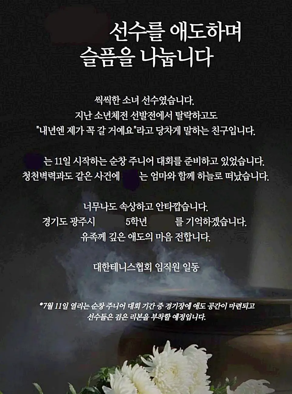 【서울 = 서울뉴스통신】 최정인 기자 = 경기 광주에서 발생한 추락 사고로 안타깝게 세상을 떠난 11세 A양이 테니스 유망주였던 사실이 뒤늦게 알려졌다. A양은 어머니와 함께 거리에서 변을 당했으며, 대한테니스협회는 "씩씩하고 당찬 선수였다"며 깊은 애도를 전했다. 대한테니스협회는 지난 9일 공식 홈페이지를 통해 "경기 광주 추락 사고로 희생된 A선수를 애도한다"며 A양이 테니스 꿈나무였음을 밝혔다. 협회는 A양에 대해 “지난 소년체전…