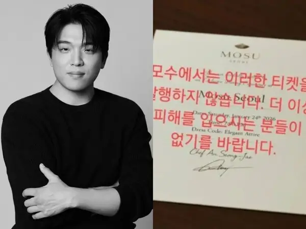 공개된 사진에는 ‘모수서울(Mosu Seoul)’이라는 식당명과 함께 2026년 1월 24일 오후 7시라는 일시, 그리고 안성재 셰프의 이름과 서명이 적혀 있어 실제 식사권처럼 보이지만, 안 셰프는 해당 티켓이 가짜임을 분명히 했다.