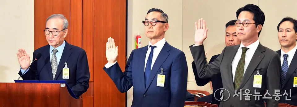 【서울 = 서울뉴스통신】 이민희 기자 = 김영섭 KT 대표이사를 비롯한 증인들이 24일 오전 서울 여의도 국회 과학기술정보방송통신위원회 전체회의에서 열린 대규모 해킹사고(통신·금융) 관련 청문회에서 선서를 하고 있다. 왼쪽부터 김영섭 KT 대표이사, 윤종하 MBK파트너스 부회장, 조좌진 롯데카드 대표이사. 2025.09.24. / 서울뉴스통신 신현성 기자 snakorea.rc@gmail.com