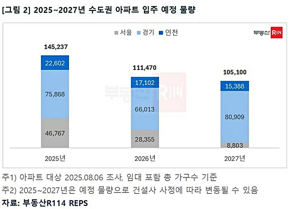 7일 부동산R114에 따르면, 6월 기준 수도권 아파트 입주 예정 물량(임대 포함)은 올해 14만5237가구에서 2026년 11만1470가구, 2027년에는 10만5100가구로 감소하는 것으로 집계됐다.