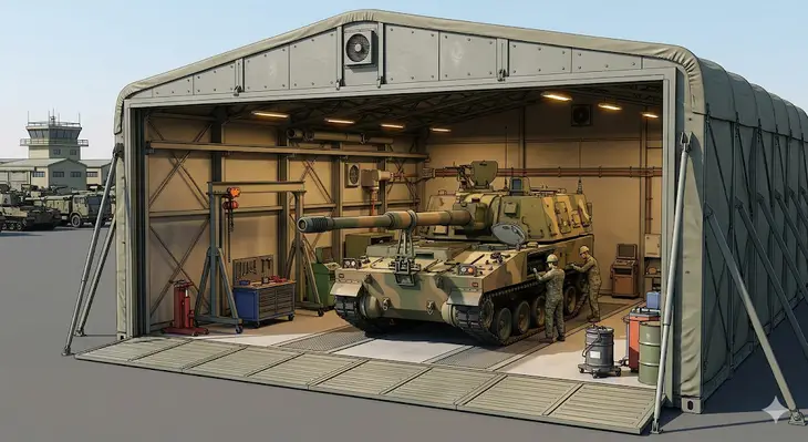 공간 확장성도 무한에 가깝다. 정비고 전면에는 전차가 드나들 수 있는 힌지(Hinge) 결합형 도어가 장착되며, 후방 벽면은 상황에 따라 떼어낼 수 있다.