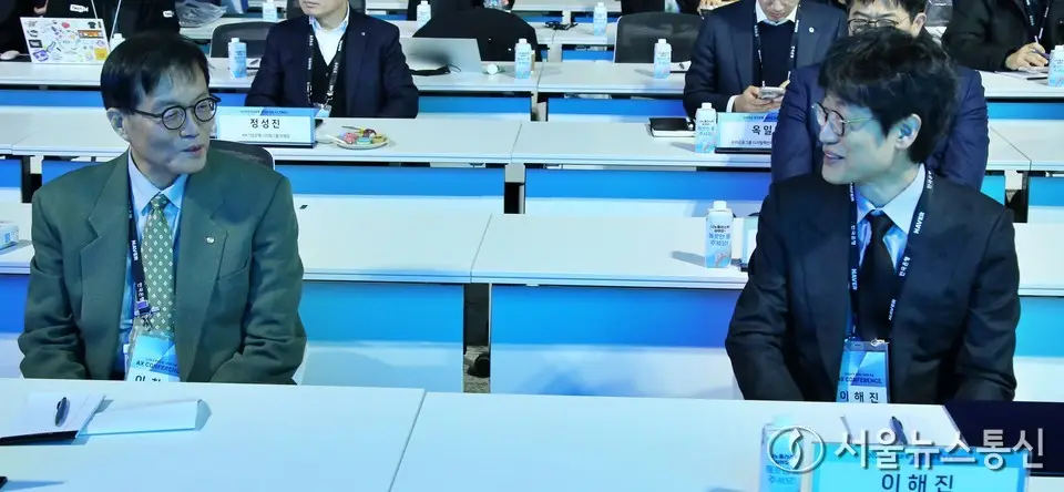 【서울 = 서울뉴스통신】 이민희 기자 = 이창용 한국은행 총재와 이해진 네이버 이사회 의장이 21일 오후 서울 중구 한국은행에서 열린 '한국은행·네이버 공동 AX 컨퍼런스'에서 대화하고 있다. 2026.01.21. nimini73@daum.net