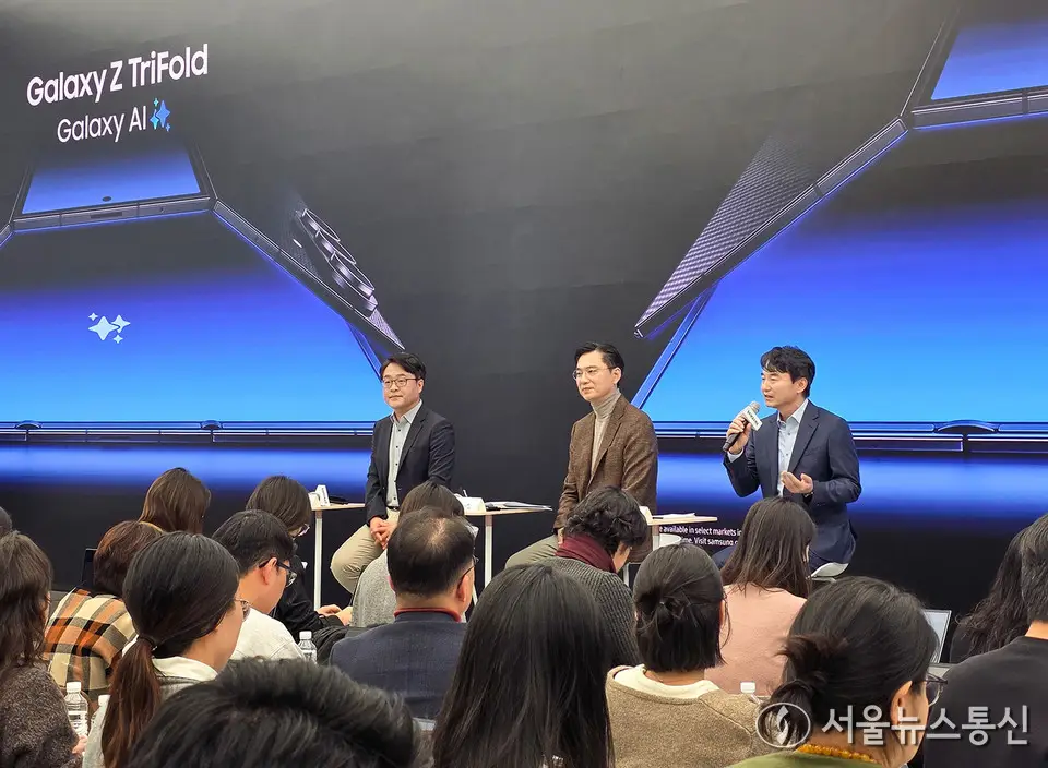 【서울 = 서울뉴스통신】 이민희 기자 = 2일 서울 서초구 삼성 강남에서 열린 '삼성전자 갤럭시Z 트라이폴드 출시 미디어데이'에서 삼성전자 MX사업부 스마트폰PP팀장 강민석(왼쪽부터) 부사장, 삼성전자 한국총괄장 임성택 부사장, 삼성전자 MX사업부 스마트폰개발2팀장 김성은 부사장이 질의응답을 하고 있다. (삼성전자 제공) 2025.12.02. / snakorea.rc@gmail.com