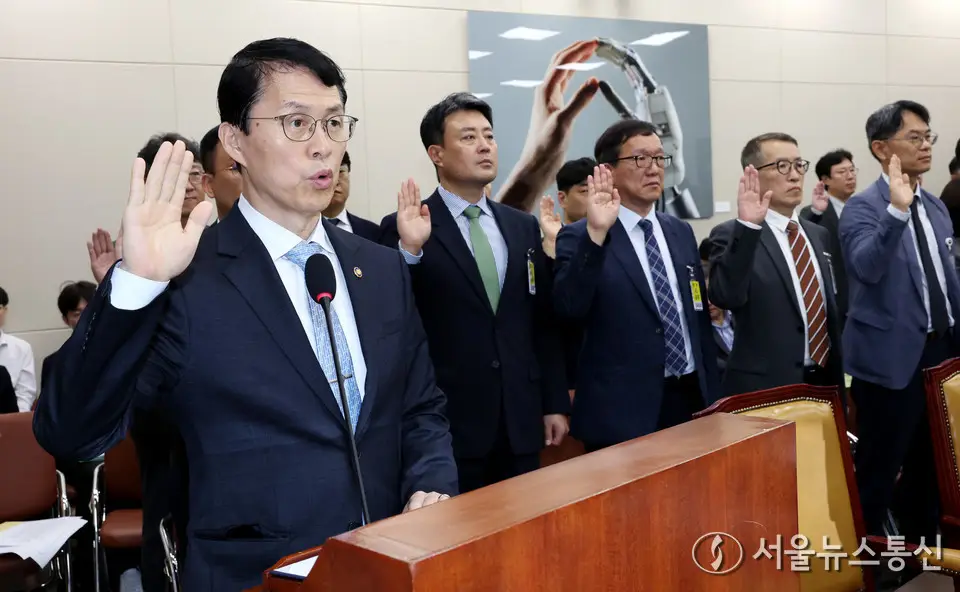 【서울 = 서울뉴스통신】 이민희 기자 = 최원호 원자력안전위원장 등 피감기관 증인들이 16일 서울 여의도 국회에서 열린 과학기술정보방송통신위원회의 원자력안전위원회 등 국정감사에서 선서를 하고 있다. 2025.10.16. / 서울뉴스통신 신현성 기자 snakorea.rc@gmail.com