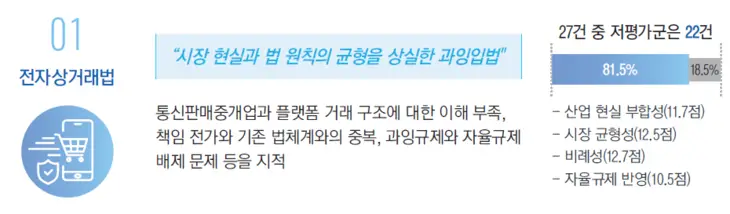 이번에 한국인터넷기업협회가 진행한 인터넷산업 규제 관련 입법 평가에서 가장 낮은 점수를 받은 입법은 ‘전자상거래 등에서의 소비자보호에 관한 법률(전자상거래법) 개정안’이다.