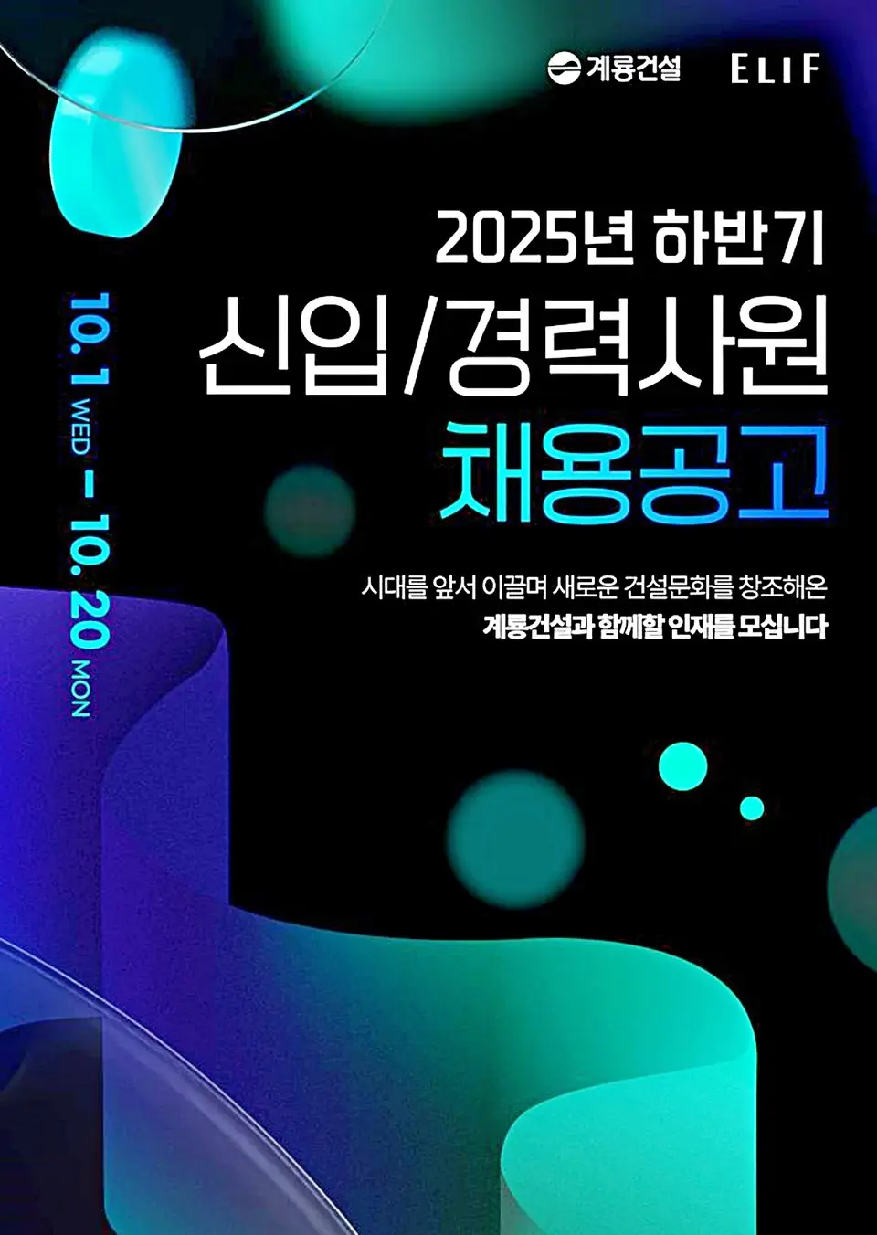 【서울 = 서울뉴스통신】 이성현 기자 = 계룡건설이 2025년도 하반기 신입 및 경력사원 공개채용을 진행한다고 15일 밝혔다. 이번 채용은 창립 55주년을 맞은 계룡건설이 인재 확보와 청년 일자리 창출을 위한 정기 공개채용의 일환이다.