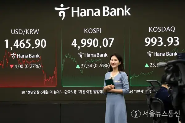 【서울 = 서울뉴스통신】 이민희 기자 = 23일 오후 서울 중구 하나은행 본점 딜링룸 전광판에 원·달러 환율이 전 거래일보다 4.20원 내린 1,465.70원을 나타내고 있다. 증시 급등과 환율 하락이 맞물리며 국내 금융 시장이 안정세를 찾는 모습이다. 사진 신현성 기자