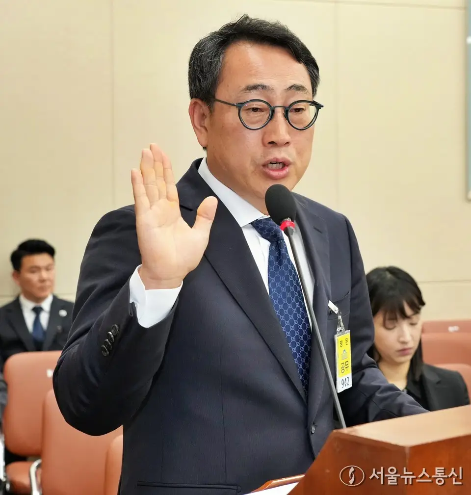 【서울 = 서울뉴스통신】 이민희 기자 =유영상 SKT 사장이 8일 서울 여의도 국회에서 열린 과학기술정보방송통신위원회 전체회의 SK텔레콤 해킹 관련 청문회에서 증인 선서를 하고 있다. 2025.05.08. / 서울뉴스통신 신현성 기자 snakorea.rc@gmail.com