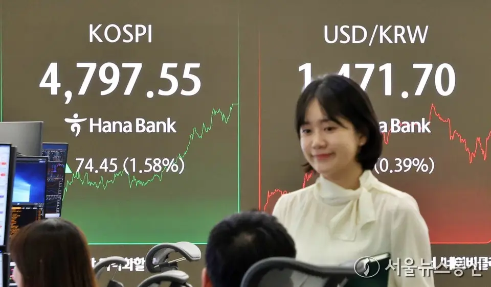 【서울 = 서울뉴스통신】 이민희 기자 = 15일 코스피가 전 거래일(4723.10)보다 74.45포인트(1.58%) 상승한 4797.55에 마감한 15일 오후 서울 중구 하나은행 딜링룸 전광판에 지수가 표시되어 있다. 2026.01.15. nimini73@daum.net