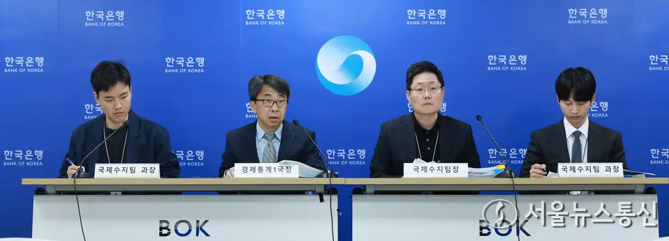【서울 = 서울뉴스통신】 이민희 기자 = 6일 오전 서울 중구 한국은행에서 2025년 9월 국제수지(잠정) 기자설명회가 열리고 있다. 왼쪽부터 김태호 국제수지팀 과장, 신승철 경제통계1국장, 박성곤 국제수지팀장, 김준영 국제수지팀 과장. (한국은행 제공) 2025.11.06. / snakorea.rc@gmail.com
