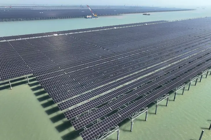 ▲양식장이 아닙니다. 지난딜 19일 중국 동부 장쑤성 롄윈강에 위치한 CNNC 톈완 갯벌 태양광 발전소에서 작업자들이 크레인을 이용해 태양광 패널을 설치하고 있다. (사진: AFP=연합뉴스)