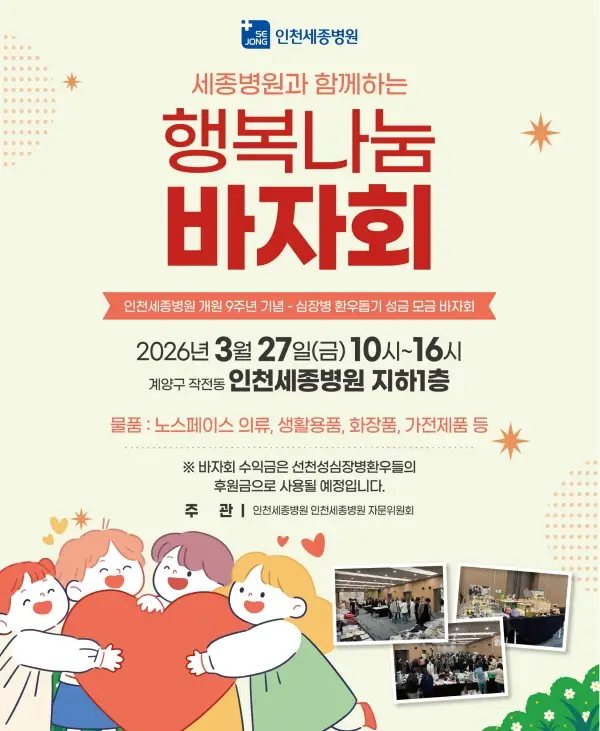 행사에서는 의류, 생활용품, 가전제품 등 다양한 물품이 합리적인 가격에 판매될 예정이며, 인천세종병원 임직원을 비롯해 후원기관, 자문위원회, 지역 유관기관과 주민들이 함께 참여해 나눔의 의미를 더할 계획이다.