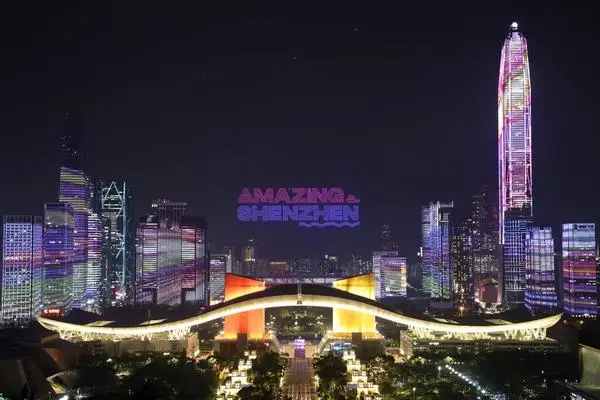 【서울 = 신화/서울뉴스통신】 권나영 기자 = 선전(深圳)경제특구 설립 45주년을 기념하는 드론 라이트쇼가 26일 밤 선전 시민광장과 인재공원에서 동시에 펼쳐져 과학기술과 예술이 어우러진 빛의 향연으로 시민과 관광객들의 시선을 사로잡았다. 이날 선전 시민광장에서 펼쳐진 선전경제특구 설립 45주년 드론 라이트쇼.