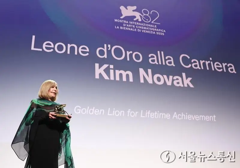 【서울 = 서울뉴스통신】 권나영 기자 =미국 배우 킴 노박이 1일(현지시간) 이탈리아 베네치아에서 열린 제82회 베니스 국제영화제 시상식에서 평생공로상 황금사자상 트로피를 들고 포즈를 취하고 있다. 신화=서울뉴스통신 2025.09.02, snakorea.rc@gmail.com , *재판매 및 DB 금지