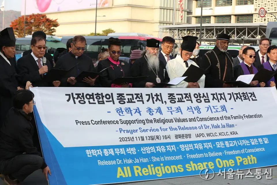 【서울 = 서울뉴스통신】 이민희 기자 = 종교자유를 위한 세계 초종교 지도자 평화 랠리 기자회견이 13일 오후 서울 광화문 광장 세종대왕상 앞에서 열렸다. 홍윤종 한국종교협의회 회장은 타징으로 집회의 시작을 알렸고, 세계 각지에서 모인 종교 지도자들은 이날 한학자 총재의 무죄 석방과 신앙과 양심의 자유 지지, 종교가 나아가야 할 방향에 대한 기도회와 기자회견을 가졌다. 2025.11.13. nimini73@daum.net