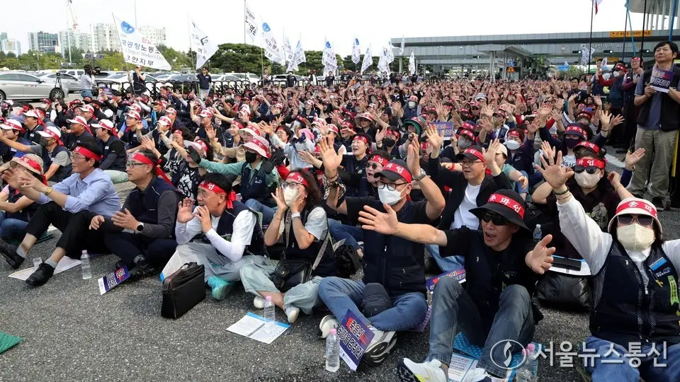 【서울 = 서울뉴스통신】 송경신 기자 = 전국공항노동자연대 관계자들이 1일 서울 김포공항 국내선 3번출구에서 열린 '10.1 전국공항노동자 총파업대회'에서 구호를 외치고 있다. 2025.10.01. / 서울뉴스통신 이성현 기자 snakorea.rc@gmail.com