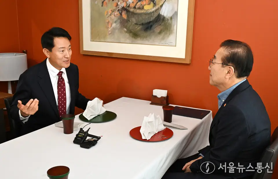 【서울 = 서울뉴스통신】 이민희 기자 = 오세훈 서울시장이 13일 오후 서울 중구 달개비에서 김윤덕 국토부장관과 오찬에 앞서 환담을 나누고 있다. (서울시 제공) 2025.11.13. / snakorea.rc@gmail.com