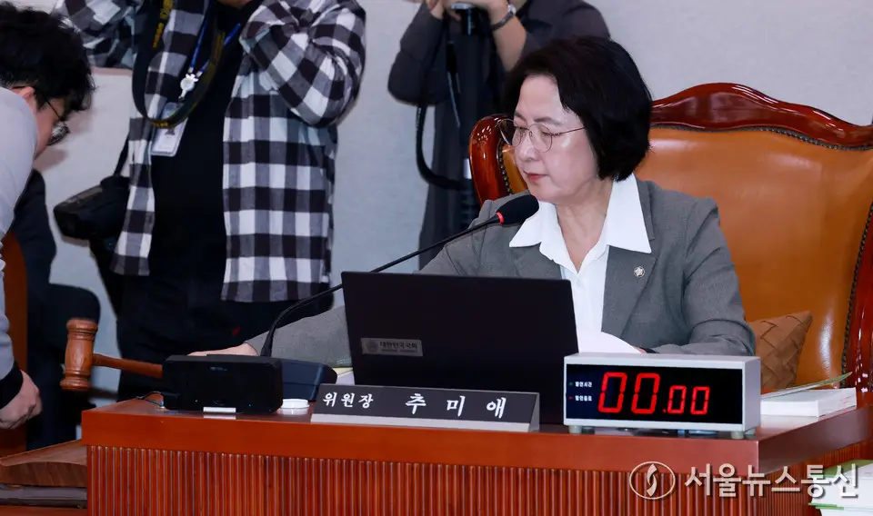 【서울 = 서울뉴스통신】 송경신 기자 = 추미애 국회 법제사법위원장이 24일 서울 여의도 국회에서 열린 법제사법위원회의 법제처에 대한 국정감사 개시를 선언하고 있다. 2025.10.24. / 서울뉴스통신 신현성 기자 snakorea.rc@gmail.com