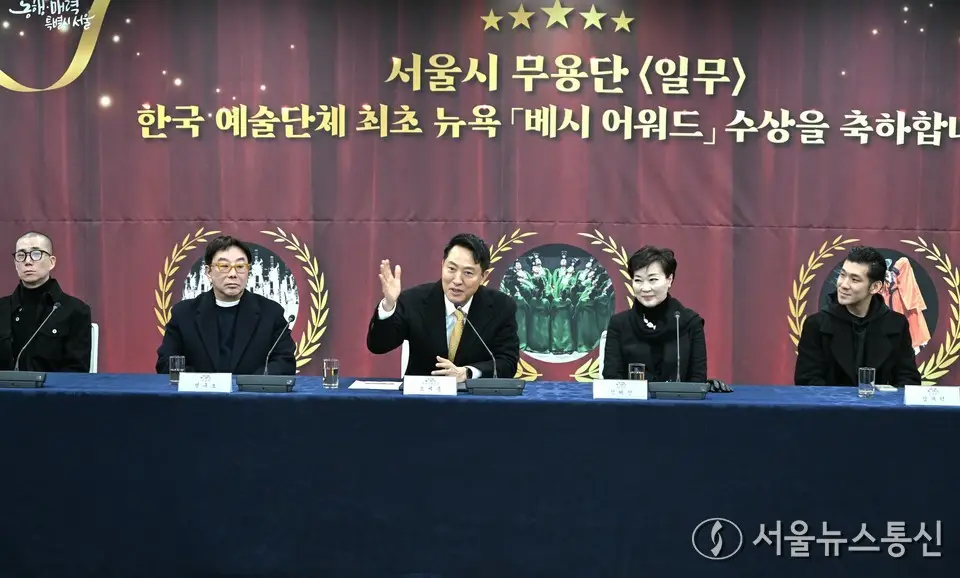 【서울 = 서울뉴스통신】 이민희 기자 = 오세훈 서울시장이 29일 서울시청에서 2026년 ‘베시 어워드’에서 최우수 안무가·창작자상을 수상한 서울시무용단을 만나 축하 인사하고 있다. (서울시 제공) 2026.01.29. nimini73@daum.net