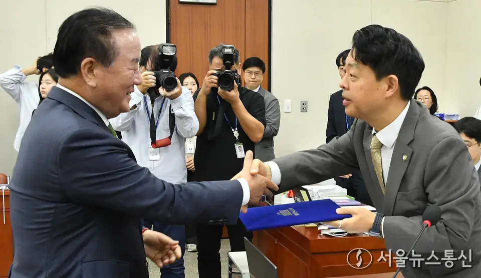 【서울 = 서울뉴스통신】 송경신 기자 = 정갑윤 한국교직원공제회 이사장이 16일 서울 여의도 국회 교육위원회에서 열린 사립학교교직원연금공단 등 국정감사에서 증인 선서문을 김영호 교육위원장에게 제출하고 있다. 2025.10.16. / 서울뉴스통신 신현성 기자 snakorea.rc@gmail.com