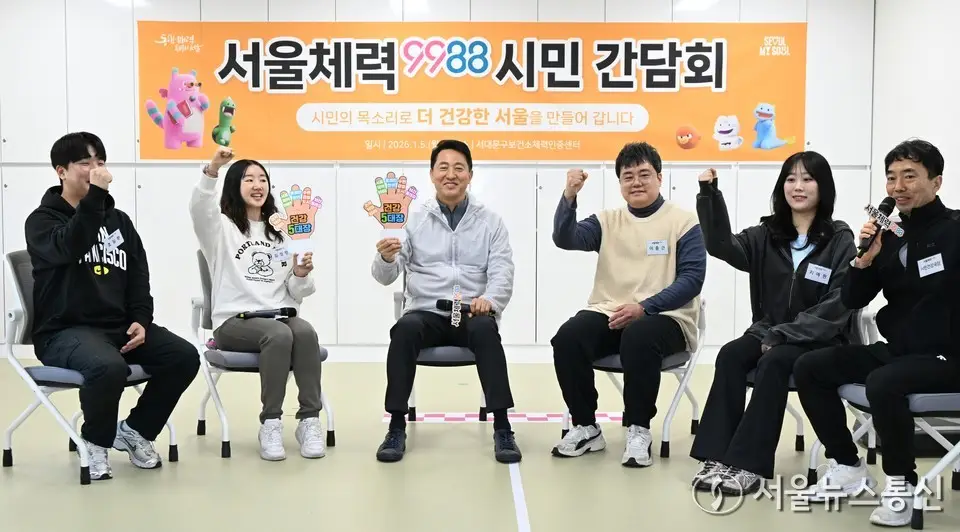 【서울 = 서울뉴스통신】 이민희 기자 = 오세훈 서울시장이 5일 서대문구보건소 체력인증센터에서 열린 '서울체력9988 시민 간담회'에서 참석자들과 기념촬영을 하고 있다. (서울시 제공) 2026.01.05. nimini73@daum.net