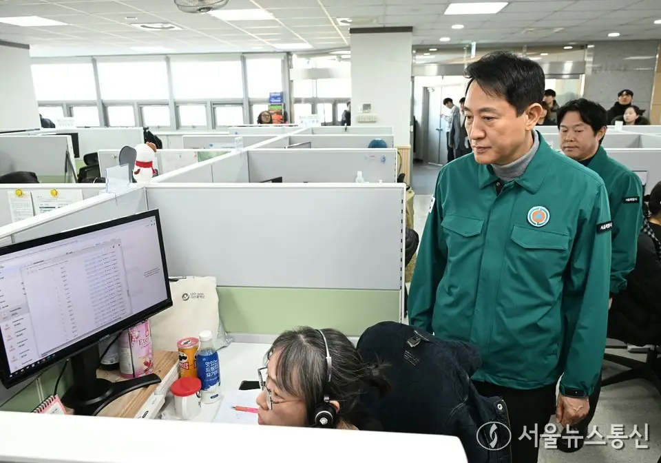 【서울 = 서울뉴스통신】 이민희 기자 = 오세훈 서울시장이 서울시내버스 파업 이틀째인 14일 서울 동대문구 120다산콜 센터를 방문해 시민 안내 및 불편접수 체계를 확인하고 있다. (서울시 제공) 2026.01.14. nimini73@daum.net