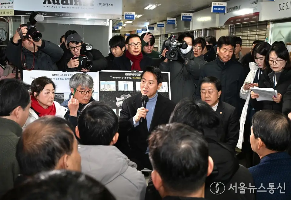 【서울 = 서울뉴스통신】 이민희 기자 = 오세훈 서울시장이 22일 서울 용산구 용산전자상가 재개발 구역인 선인상가를 찾아 상인 및 지역주민들과 간담회를 하고 있다. (서울시 제공) 2026.01.22. nimini73@daum.net