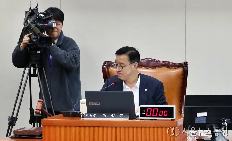 【서울 = 서울뉴스통신】 송경신 기자 =17일 서울 여의도 국회에서 열린 기후위기특별위원회 전체회의에서 위성곤 위원장이 의사봉을 두드리고 있다. 2025.11.17. snakorea.rc@gmail.com