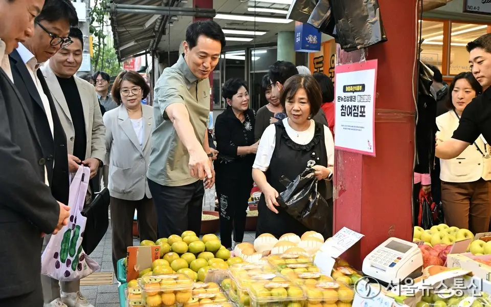【서울 = 서울뉴스통신】 이민희 기자 = 오세훈 서울시장이 2일 추석 연휴를 앞두고 구로구 고척근린시장을 방문해 장바구니 물가를 점검하고 있다. (서울시 제공) 2025.10.02. / snakorea.rc@gmail.com
