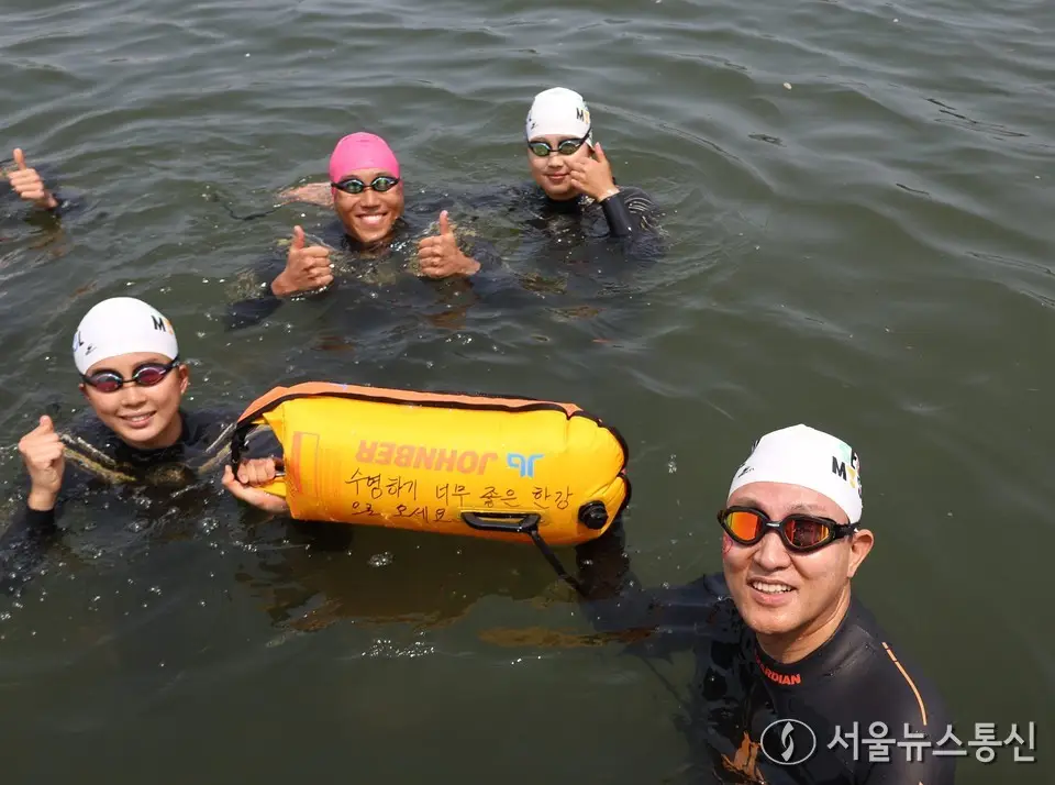 【서울 = 서울뉴스통신】 이민희 기자 = 오세훈(오른쪽) 서울시장이 30일 서울 한강에서 열린 제2회 쉬엄쉬엄 한강3종 축제에서 수영종목에 출발 전 ‘수영하기 너무 좋은 한강으로 오세요 수질 환상적!’ 안전부이를 들고 도강을 준비하고 있다. (서울시 제공) 2025.05.30. / snakorea.rc@gmail.com