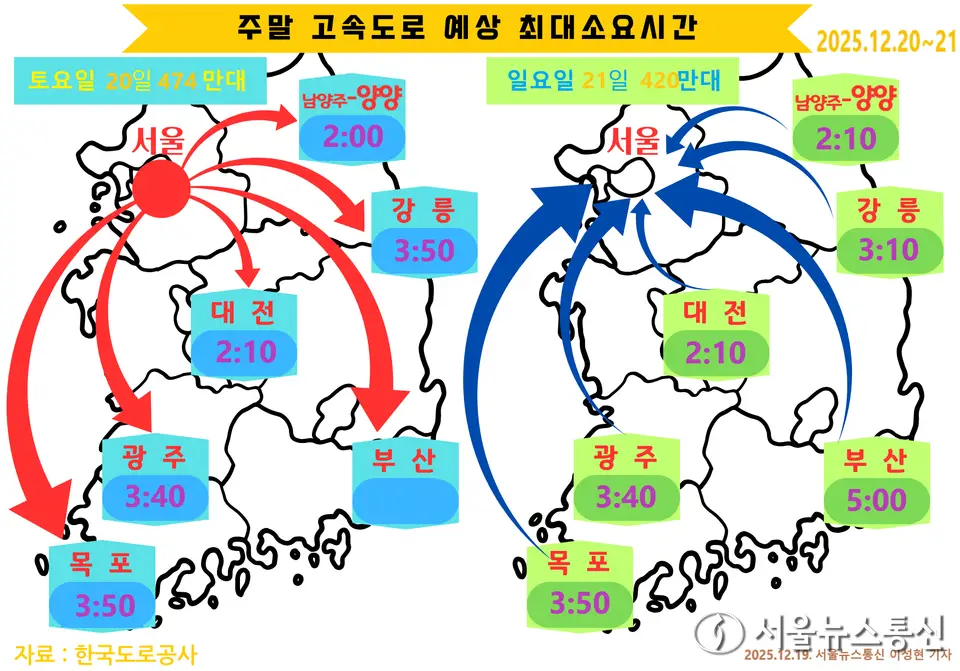 지역별 예상 소요시간은 토요일 서울 출발 기준 △대전 2시간 10분 △부산 5시간 10분 △강릉 3시간이며, 일요일 서울 방향은 △대전 2시간 10분 △부산 5시간 △강릉 2시간 10분으로 전망됐다.