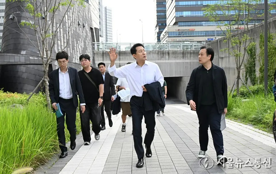 【서울 = 서울뉴스통신】 이민희 기자 = 오세훈 서울시장이 23일 오전 서울 송파구 8호선 문정역을 찾아 스포츠가든 조성지를 살펴보고 있다. (서울시 제공) 2025.07.23. / snakorea.rc@gmail.com