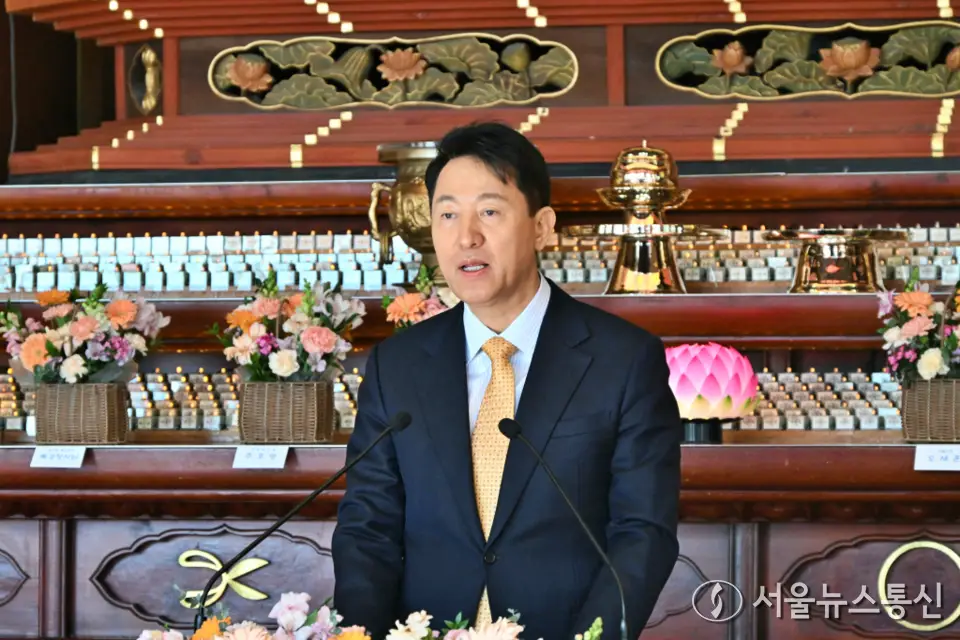 【서울 = 서울뉴스통신】 이민희 기자 = 오세훈 서울시장이 27일 서울 종로구 조계사에서 열린 한국불교종단협의회 신년하례법회에서 축사를 하고 있다. (서울시 제공) 2026.01.27. nimini73@daum.net