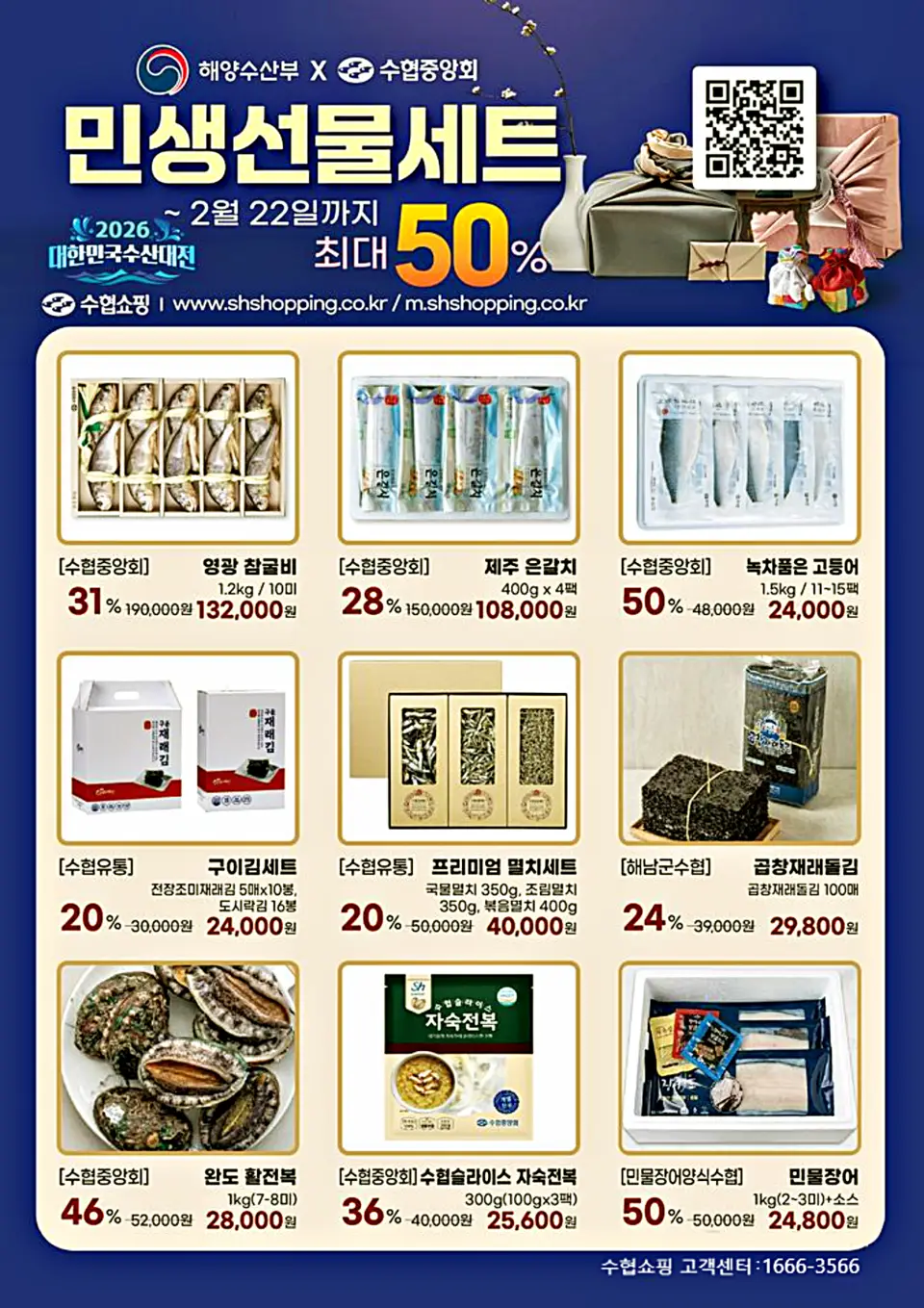 해수부는 전국 56개 판매처(오프라인 24곳·온라인 32곳)에서 ‘대한민국 수산대전-설 특별전’을 개최한다. 명태, 고등어, 갈치, 오징어, 참조기, 마른멸치 등 대중성 어종과 김·전복 등 소비자 선호도가 높은 품목이 대상이다. 설 명절 기간에는 1인당 할인 한도를 2만원으로 높여 소비자는 최대 50% 할인된 가격으로 수산물을 구매할 수 있다.