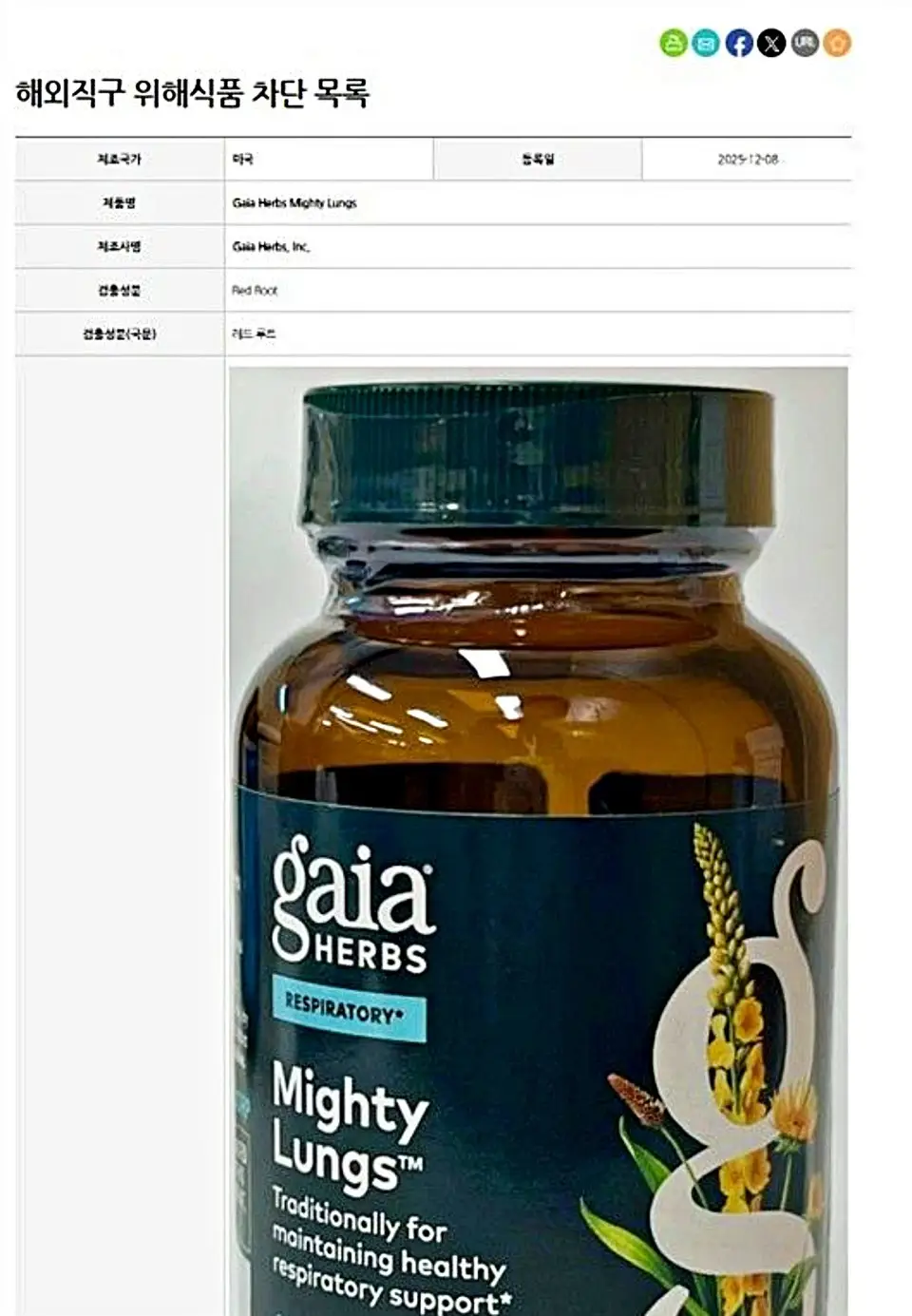 식약처는 해당 제품에 대해 관세청에 통관 보류를 요청하고, 방송통신심의위원회에 온라인 판매사이트 접속 차단을 요청하는 등 관계기관과 협업해 국내 반입을 차단했다. 아울러 소비자 확인을 돕기 위해 ‘해외직구식품 올바로’ 누리집에 제품명, 제조사, 위해 성분, 제품 사진 등의 정보를 공개했다.
