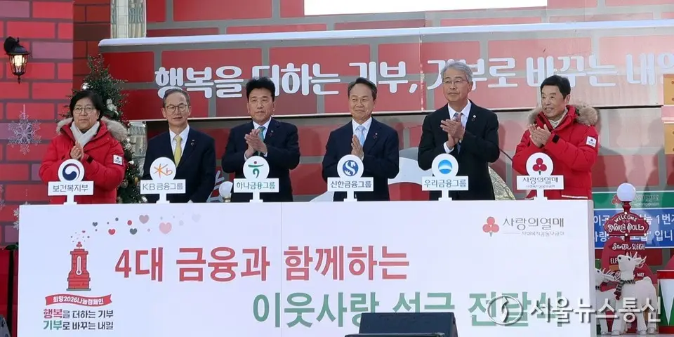 【서울 = 서울뉴스통신】 이민희 기자 = 1일 오후 서울 종로구 광화문광장에서 열린 사랑의 열매 '희망2026나눔캠페인' 출범식 및 사랑의온도탑 점등식에 4대 금융과 함께하는 이웃사랑 성금 전달식이 진행되고 있다. 왼쪽부터 정은경 보건복지부 장관, 양종희 KB금융그룹 회장, 함영주 하나금융그룹 회장, 진옥동 신한금융그룹 회장, 임종룡 우리금융그룹 회장, 김병준 사랑의열매 회장. 2025.12.01. snakorea.rc@gmail.com