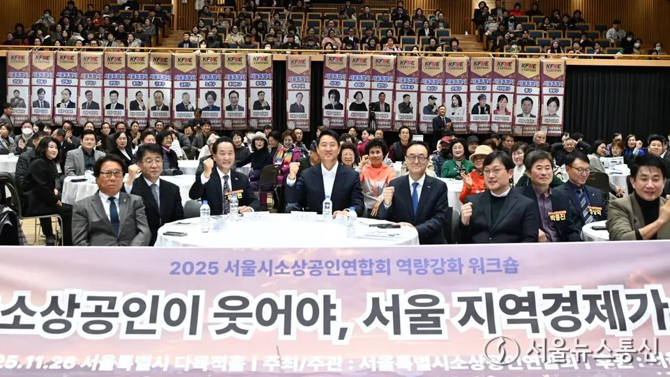 【서울 = 서울뉴스통신】 이민희 기자 = 26일 서울 중구 서울시청에서 열린 '2025 서울시소상공인연합회 역량강화 워크숍'에서 오세훈 서울시장을 비롯한 참석자들이 기념촬영을 하고 있다. (서울시 제공) 2025.11.26. / snakorea.rc@gmail.com