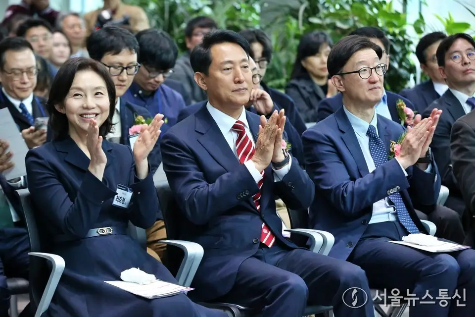 【서울 = 서울뉴스통신】 이민희 기자 = 오세훈 서울시장과 최호정 서울시의회 의장이 25일 오후 서울 서초구  AI허브 메인센터에서 열린 AX 혁신센터 출범식에 참석해 박수치고 있다. 2025.11.25. nimini73@daum.net