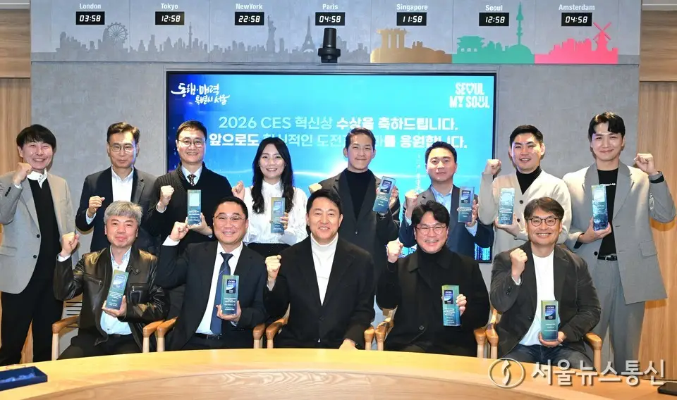 【서울 = 서울뉴스통신】 이민희 기자 = 오세훈 서울시장이 26일 서울시청에서 열린 ‘CES 2026 혁신상 수상 기업 간담회’에서 참석자들과 기념촬영하고 있다. (서울시 제공) 2026.01.26. nimini73@daum.net