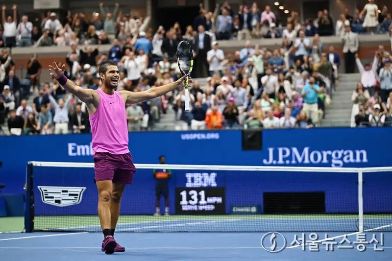 【서울 = 서울뉴스통신】 이성자 기자 =카를로스 알카라즈(스페인)가 2025 US오픈 남자 단식 결승에서 얀니크 시너(이탈리아)를 꺾고 생애 두 번째 US오픈 우승을 차지했다. 알카라즈는 결승에서 안정적인 서브와 강력한 포핸드로 시너를 압도하며 경기 내내 주도권을 잡았다. 이번 우승으로 그는 그랜드슬램 단식 타이틀 3회를 기록하게 됐다. 사진은 이날 미국 뉴욕에서 열린 US오픈 남자 단식 결승에서 스페인의 카를로스 알카라즈가 이탈리아의 얀니크 시너를 꺾고 승리한 후 환호하고 있는 모습. 2025.9.8/사진=신화/서울뉴스통신/,. snakorea.rc@gmail.com , *재판매 및 DB 금지