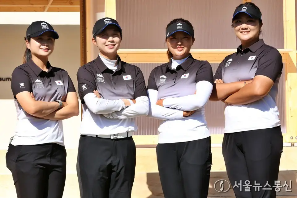 【서울 = 서울뉴스통신】 이민희 기자 = 22일 경기도 고양시 뉴코리아 컨트리클럽에서 국가대항전 한화 라이프플러스 인터내셔널 크라운에 출전한 한국 대표팀이 포토콜에서 포즈를 취하고 있다. 왼쪽부터 최혜진, 김효주, 고진영, 유해란. 2025.10.22. / 서울뉴스통신 신현성 기자 snakorea.rc@gmail.com
