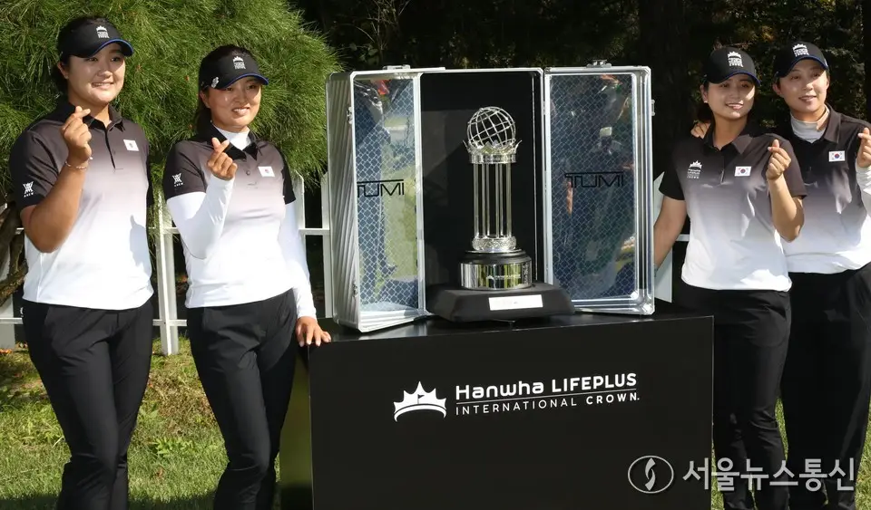 【서울 = 서울뉴스통신】 이민희 기자 = 22일 경기도 고양시 뉴코리아 컨트리클럽에서 국가대항전 한화 라이프플러스 인터내셔널 크라운에 출전한 한국 대표팀이 포토콜에서 포즈를 취하고 있다. 오른쪽부터 김효주, 최혜진, 고진영, 유해란. 2025.10.22. / 서울뉴스통신 신현성 기자 snakorea.rc@gmail.com